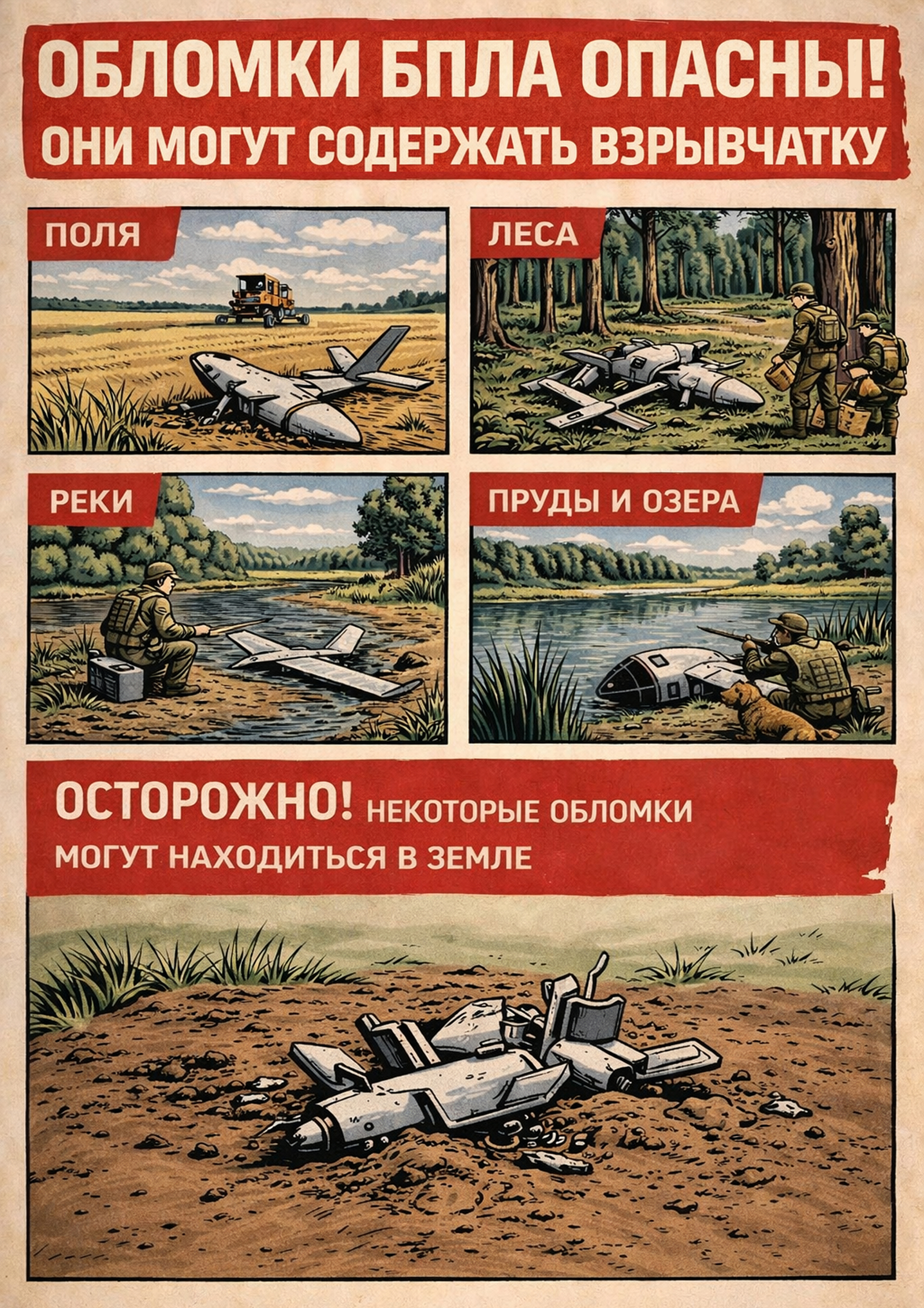 Соблюдайте меры предосторожности при обнаружении обломков беспилотного летательного аппарата (БПЛА). Они могут содержать неразорвавшиеся боеприпасы, самодельные взрывные устройства или быть обработаны отравляющими веществами.